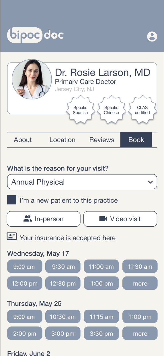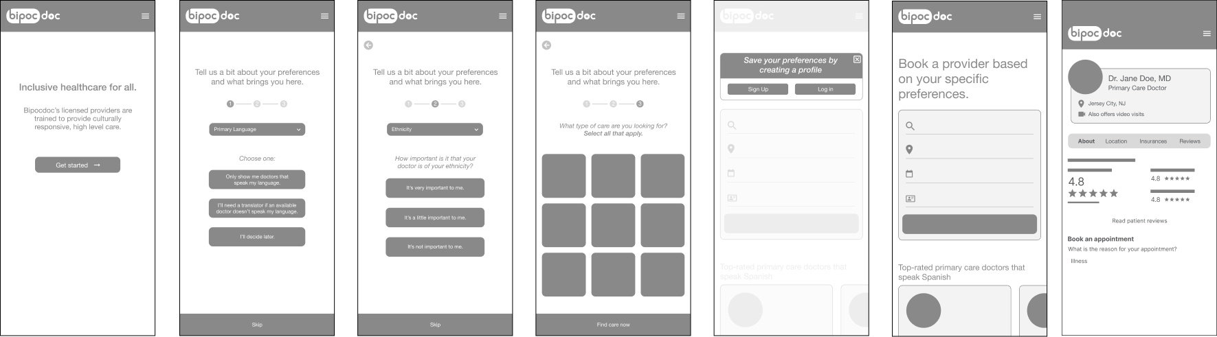 These screens are for the user to enter their preferences, including; what language they prefer their doctors to speak, their ethnicity and how important it is that their doctors are of the same, and what type of care they’ll be using BIPOC Doc to find. We were intending for these screens to pique a first-time user’s interest and really give them a taste of what BIPOC Doc can offer them.