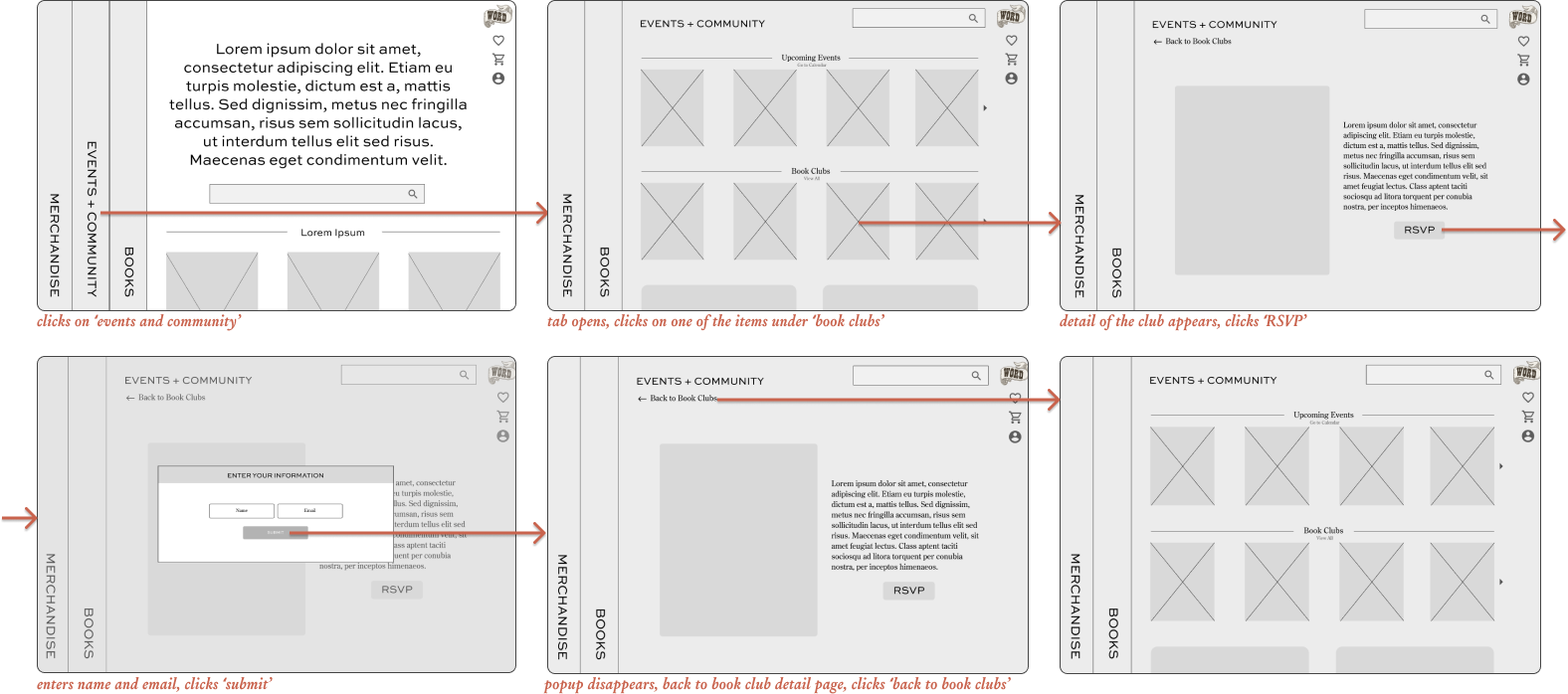 Next, I made some rough sketches to help me visualize the site, created user flows for the personas, and finally created wireflows to illustrate how those people would be moving through the website.