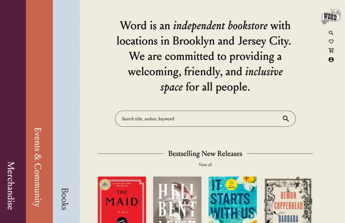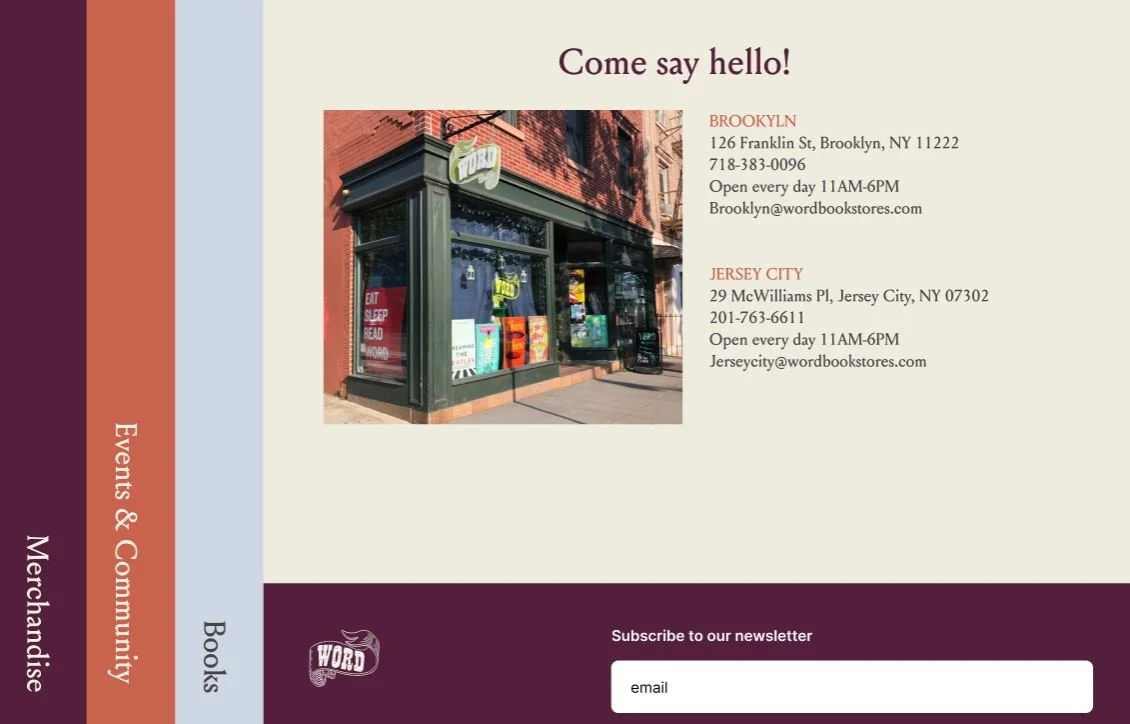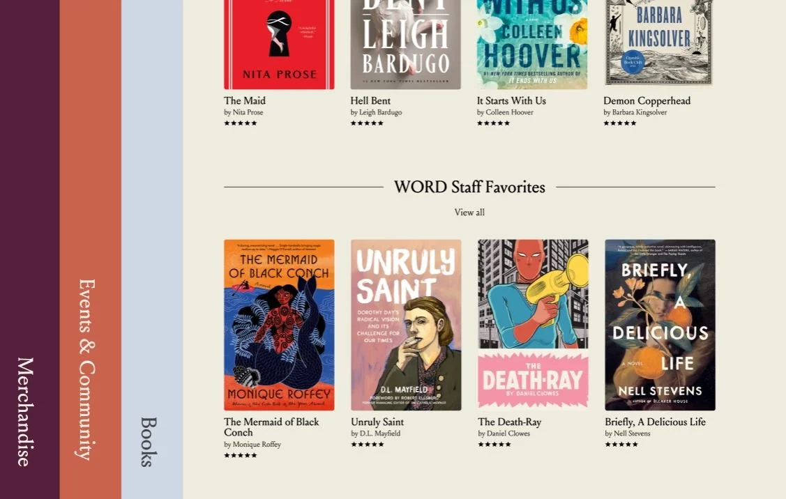 Scrolling down on the homepage will reveal WORD bookstore staff picks (another big part of their DNA - at the physical store, there is a huge display of books with handwritten notes about them by the employees. It is also showcased on their current site, just not as prominently.)