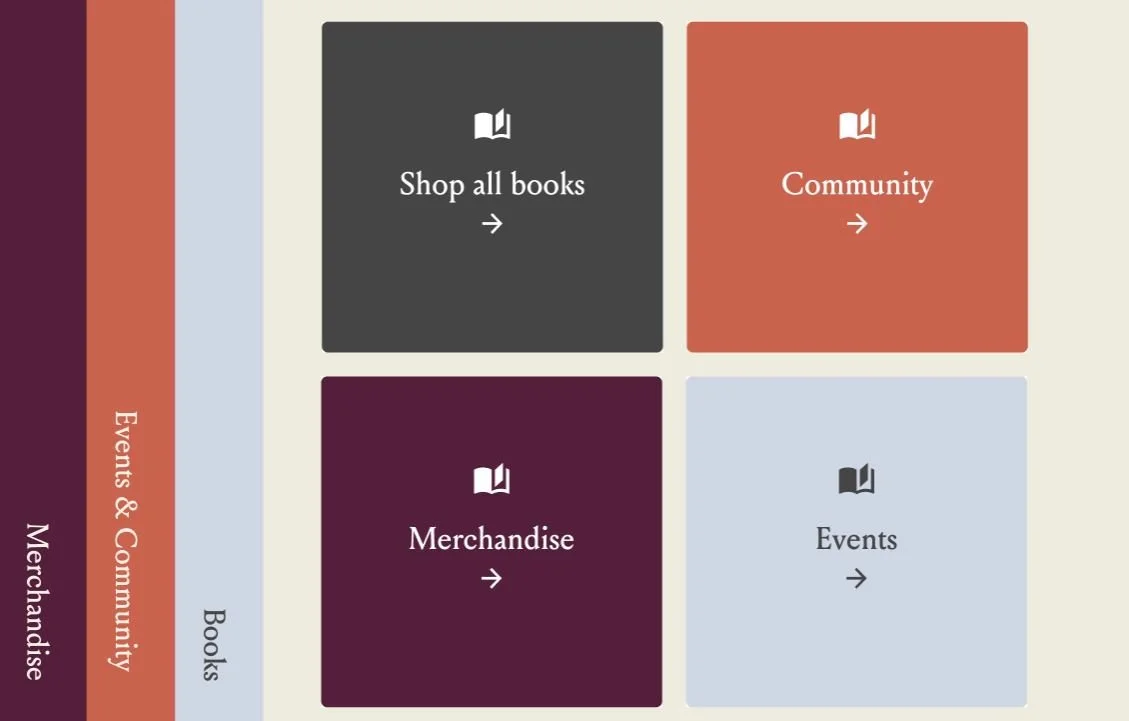 I decided on three main categories - Events + Community, Books, and Merchandise.