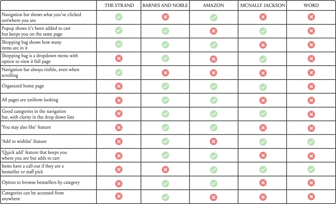 First, I conducted comparative + competitive analysis of other companies that offer similar services - both independent bookstores and chains.