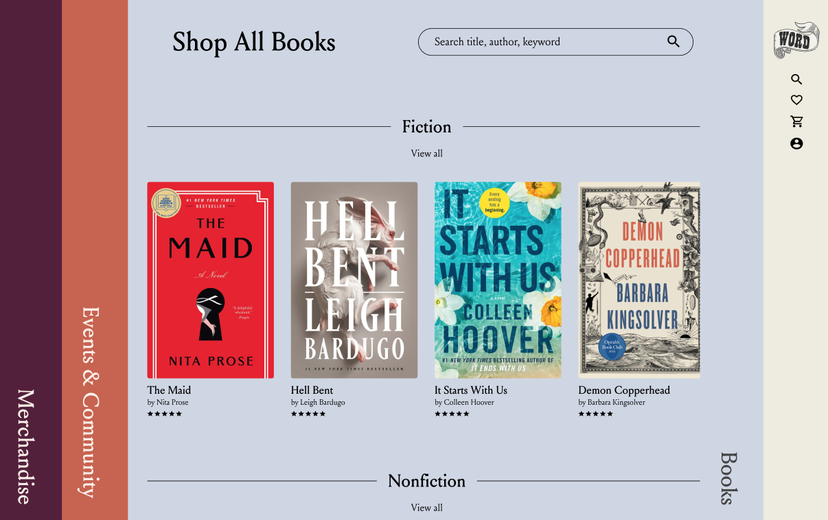 Independent bookstore supporters want to be able to utilize the Word website so that they can search for what they like, discover new interests, complete purchases smoothly, and view upcoming events.